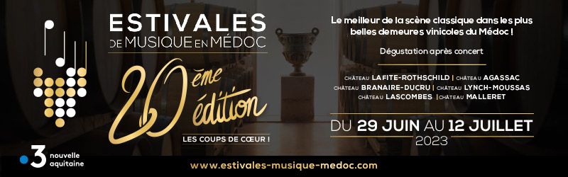 L’été 2023 verra se dérouler la 20ème édition des Estivales de musique en Médoc. Unique en Europe, le festival permet de découvrir les jeunes talents les plus prometteurs de la musique classique. Son cadre sera tout aussi unique, des châteaux du Médoc (avec dégustation de vin après les concerts) à l’Auditorium de Bordeaux.